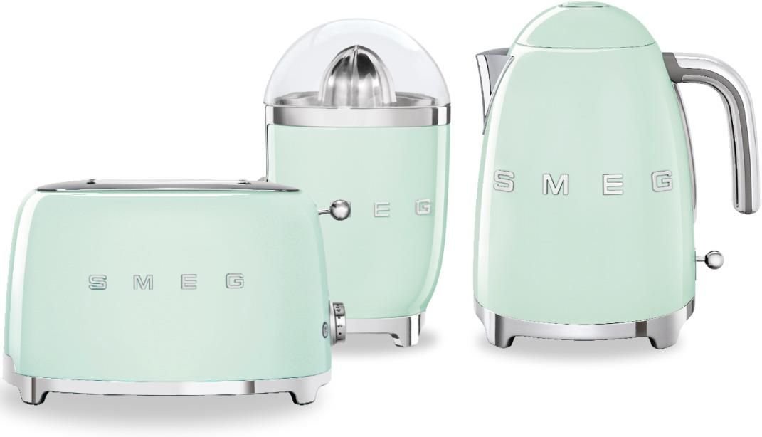 Zestaw SMEG: czajnik, toster na 2 kromki i wyciskarka do cytrusów. Styl retro, wysoka jakość, codzienna wygoda.
