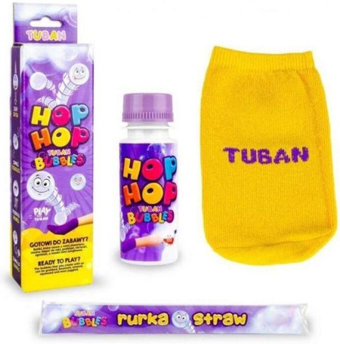 ZESTAW DO PODBIJANIA BANIEK - HOP HOP BUBBLES HOP HOP BUBBLES od firmy Tuban to rewelacyjny zestaw do baniek mydlanych, które można łapać do ręki, obracać, zgnieść, podbijać, a nawet nimi żonglować. Zestaw zapewni Twojemu dziecku godziny świetnej zabaw na świeżym powietrzu. ZAWARTOŚĆ ZESTAWU: Materiałowa rękawica na dłoń Płyn do baniek 60 ml Plastikowa słomka do dmuchania baniek SPECYFIKACJA: Pojemność płynu: 60 ml Długość słomki ok.: 20 cm Wymiary rękawiczki ok.: 12 x 7 cm Wymiary opakowania ok.: 7 x 4 x 25,5 cm Sugerowany wiek: 3 lata+ UWAGA Kolory zestawu mogą nieznacznie różnić się od przedstawionego na zdjęciach. OSTRZEŻENIE Nieodpowiednie dla dzieci poniżej 3 roku życia. Ryzyko zadławienia płynem. Nie należy połykać płynu do robienia baniek mydlanych. Podczas użytkowania konieczny jest nadzór osoby dorosłej. Opakowanie nie jest zabawką. Płyn może pozostawić plamy. Należy unikać kontaktu z oczami. W razie konieczności zasięgnięcia porady lekarza należy pokazać pojemnik lub etykietę. W przypadku spożycia wypłukać usta wodą, nie wywoływać wymiotów. W przypadku kontaktu ze skórą: zanieczyszczone partie zmyć dokładnie wodą. W przypadku kontaktu z oczami: zanieczyszczone oczy przepłukiwać dokładnie wodą przez co najmniej 15 minut, przy otwartych powiekach. Unikać silnego strumienia wody. W przypadku złego samopoczucia zasięgnąć porady/zgłosić się pod opiekę lekarza. Może powodować wystąpienie reakcji alergicznej.
