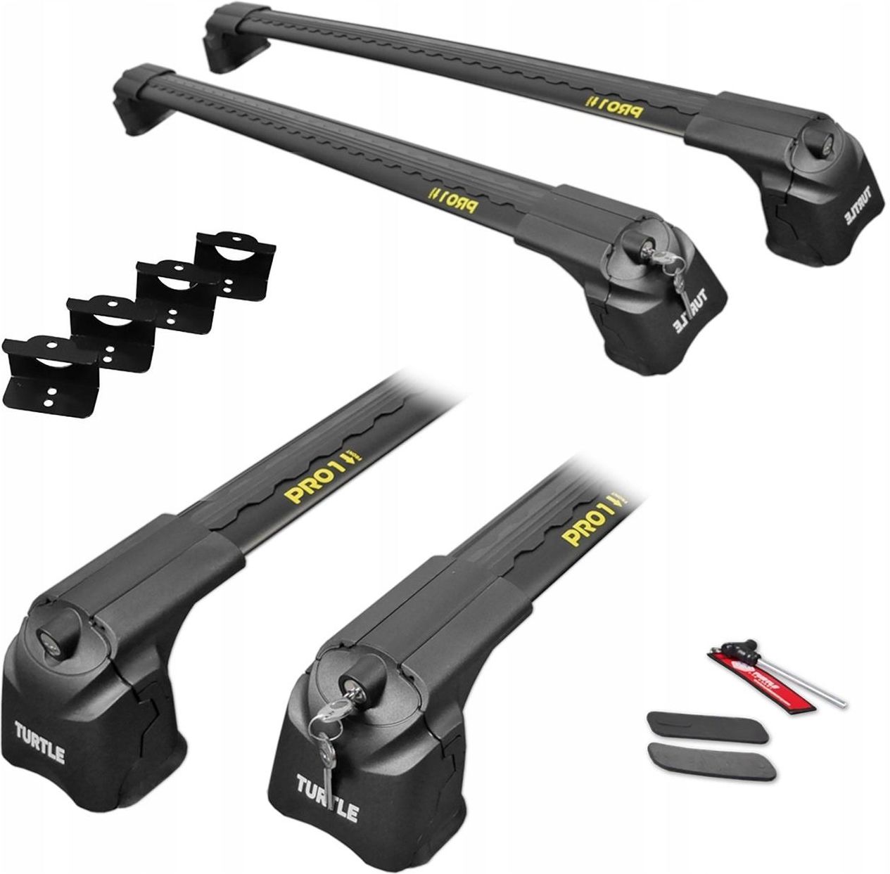 Bagażnik Turtle Air-3 Nowa, niska linia bagażników Turtle montowana w fabryczne punkty montażowe. Dedykowany do aut zpunktami montażowymi. Listasamochodów na dole oferty. Bagażnik montowany do jednego punktu montażowego. Bagażnik bazowy Turtle to bardzo lekki aluminiowy bagażnik bazowy. Aerodynamiczny kształt, niski poziom hałasu podczas jazdy i wysoka jakość wykonania to główne zalety tego modelu. Cechy produktu Dopuszczalna ładowność 75 kg (sprawdź również nośność dachu pojazdu) Nowoczesny wzór profilu aluminiowego Duży wybór długości profilu gwarantujący precyzyjne dopasowanie Dodatkowa regulacja rozstawu na głowicach Aerodynamiczny kształt Bardzo cichy podczas jazdy Zabezpieczenie antykradzieżowe (zamek w obydwu głowicach) Elementy mocujące pokryte elastyczną powłoką zapobiegającą powstawaniu rys Łatwy montaż niewymagający dodatkowych narzędzi Montaż akcesoriów za pomocą obejmy lub wygodnych w użyciu wsuwek Zapasowy kluczyk Łatwy i intuicyjny system montażu - w zestawie wszystkie niezbedne elementy. Górna szyna T zabezpieczona jest specjalną unikatową gumą. Lista samochodów Ford Transit Connect 2002-2012(punkty montażowe) Ford Tourneo Connect 2002-2012(punkty montażowe)