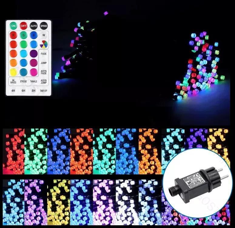 Miękki i elastyczny przewód z kolorowymi lampkami o długości 50m i 3m do sterownika, którym można oplatać drzewa, krzewy lub figury. Lampki mogą być stosowane w środku pomieszczeń oraz na zewnątrz, są odporne na działanie niskich temperatur, a diody LED są zabezpieczone przed wilgocią. 32-przyciskowy pilot zdalnego sterowania, 20 kolorów: 16 pojedynczych kolorów + 4 specjalne kombinacje kolorów (niebieski i biały, pomarańczowy i fioletowy, czerwony, niebieski i biały, wielokolorowy), 7 trybów dynamicznych, 4/6/8-godzinny timer. Sznur lampek choinkowych zasilany napięciem bezpiecznym 31V. Wodoodporność IP 44 - można bezpiecznie stosować na dworze.