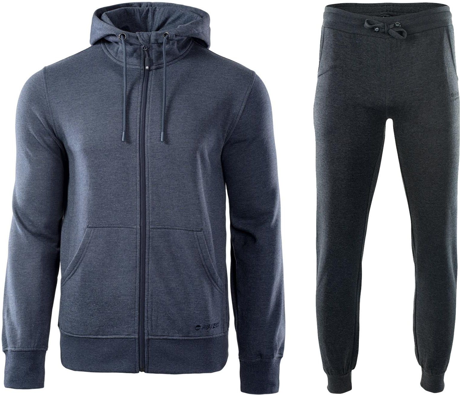 Hi-Tec - sportowy dres Bluza sportowa z kapturem producent: Hi-Tec model: Silian kod produktu: LIGHT NAVY MELANGE rozmiar: M kolor: granatowy materiał: 78% poliester, 22% bawełna, 280 g/m2 zapięcie: zapinana na zamek błyskawiczny opakowanie: oryginalne, producenta kieszenie: typu kangur ściągacz: dół bluzy oraz rękawy zakończone ściągaczem zasotoswanie: do użytku codzienne oraz do wszelkiej aktywności sportowej jak bieganie, piłka nożna, siłownia i fitness Spodnie sportowe producent: Hi-Tec model: Melian kod produktu: DARK GREY MELANGE rozmiar: M kolor: szary materiał: 78% poliester, 22% bawełna 280 g/m2 opakowanie: oryginalne, producenta kieszenie: dwie boczne kieszenie ściągacz: w pasie ściągacz wraz z sznurkami z możliwością regulacji, dół spodni prosty zasotoswanie: do użytku codzienne oraz do wszelkiej aktywności sportowej jak bieganie, piłka nożna, siłownia i fitness Wymiary dla rozmiaru M Bluza: Na wzrost: 171-173.5 cm Szerokość w klatce: 53 cm Długość rękawa od szyi: 78 cm Długość całkowita bluzy: 69 cm Spodnie: Na wzrost: 171-173.5 cm Długość od kroku: 79.5-80.5 cm Obwód pasa: 88-92 cm Obwód bioder: 102-106 cm Obwód bioder: 102-106 cm