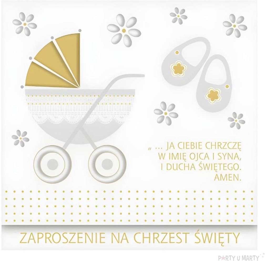 Chrzest Święty jest niezwykle ważną chwilą. To właśnie w momencie przyjęcia tego sakramentu człowiek staje się członkiem Mistycznego Ciała Chrystusa, czyli Kościoła. Dzień Chrztu Świętego to nie tylko uroczystość kościelna, ale również przyjęcie w gronie najbliższych. Jeśli zatem przygotowujesz zabawę z okazji Chrztu Świętego dziecka, z całą pewnością nie możesz zapomnieć o wyjątkowych zaproszeniach dla gości! Na zaproszeniach widać dziecięcy wózek, buciki, kwiatki i napis "JA CIEBIE CHRZCZĘ W IMIĘ OJCA I SYNA, I DUCHA ŚWIĘTEGO, AMEN" oraz "ZAPROSZENIE NA CHRZEST ŚWIĘTY". W skład zestawu wchodzi aż 10 zaproszeń.✅ Papierowy produkt jest przyjazny dla środowiska i łatwy w utylizacji.✅ Zaproszenia przeznaczone są do samodzielnego wypełnienia.Jeśli zamierzasz uczcić Chrzest Święty dziecka w gronie najbliższych, poinformowanie ich o uroczystości przy pomocy pięknych zaproszeń na pewno będzie strzałem w dziesiątkę! biały,Chrzest Św.,kwadratowy,MAKI