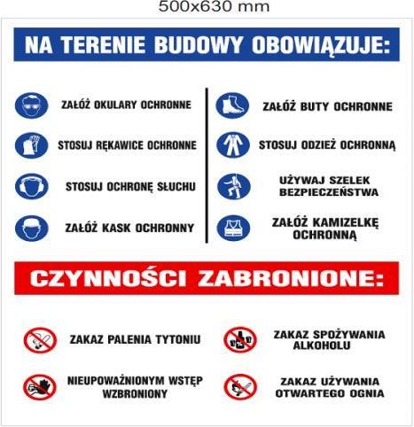 Tablica zbiorcza BHP z zastosowaniem dla terenów budowy, hal itp. Dostępna w rozmiarze 500x630mm Grubość płyty PCV to: - standardowa 1 mm
