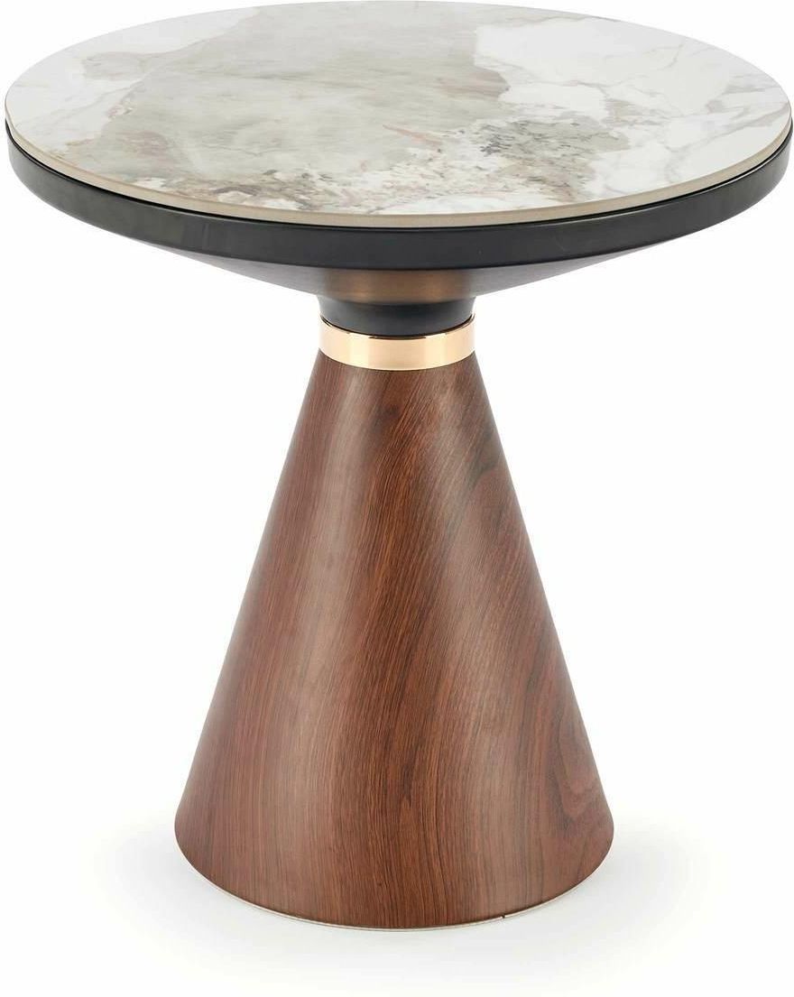 Stolik kawowy Suli: Elegancki mebel o połączeniu ceramiki i metalu Stolik kawowy Suli to wyjątkowy mebel, który wyróżnia się nowoczesnym stylem i luksusowym wykończeniem. Zaprojektowany z myślą o nowoczesnych wnętrzach, stolik kawowy o wysokości 53cm przyciąga uwagę swoją elegancją i unikalnym połączeniem materiałów. Materiały użyte do produkcji stolika kawowego Suli są starannie dobrane, aby stworzyć mebel o wysokiej jakości i estetyce. Blat wykonany z ceramiki imitującej biały marmur nadaje mu wyjątkowo elegancki wygląd. Trwała i łatwa w utrzymaniu czystości powierzchnia o średnicy 50cm doskonale sprawdzi się w codziennym użytkowaniu. Stelaż stolika wykonany jest z metalu, malowanego na kolor złoty i orzecha ciemnego. Połączenie metalu i drewna nadaje mu połączenia stylów nowoczesnego oraz glamour. Kolorystyka stolika - orzechowy, złoty i marmur biały - tworzy harmonijną kompozycję, która pasuje do różnych aranżacji wnętrz. Stolik kawowy Suli to nie tylko praktyczne rozwiązanie do serwowania napojów i przechowywania przedmiotów, ale także wyjątkowy element dekoracyjny, który doda blasku i wyrafinowanego stylu każdemu wnętrzu. Dzięki swojemu unikalnemu designowi i wysokiej jakości wykonaniu, stolik kawowy stanie się niezastąpionym elementem aranżacji salonu, jadalni czy pokojem dziennego. O tym warto pamiętać! Połączenie ceramiki i metalu, które nadaje mu ekskluzywny charakter. Wyjątkowy wygląd i imitacja białego marmuru, dodająca mu elegancji. Doskonale dopasowany kształt okrągłego blatu, który sprzyja swobodnej rozmowie i harmonijnemu ustawieniu w pomieszczeniu. Wykończenie stelażu w kolorze złotym i orzechowym, które nadaje meblowi glamour i luksusowy wygląd.