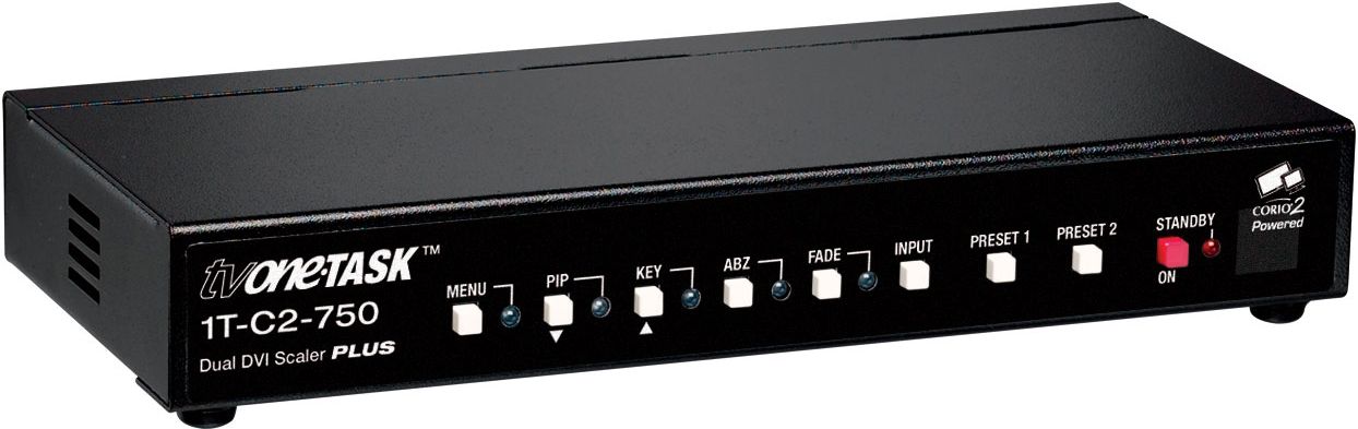 Podwójny skaler, przełącznik 2x1 DVI-I (DVI-D, RGBHV,RGBS) 2 x PIP z bankiem pamięci, miksowanie i kluczowanie, maks. rozdz. 1920x1200, kompatybilny z HDMI; Wejście: 2x DVI-I. Wyjście: 1x DVI-ICzas dostawy: ok. 7-14 dni - wymaga potwierdzeniaPodwójny skaler Tv One 1T-C2-750, przełącznik 2x1 DVI-I (DVI-D, RGBHV,RGBS, YPbPr). Podwójny skaler PIP z bankiem pamięci na logo, funkcje miksowania i kluczowania. Maks. rozdzielczość 1920x1200, 1080p (HDCP).Kompatybilny z HDMI; Wejście: 2x DVI-I. Wyjście: 1x DVI-I (cyfrowe i analogowe).Nowy skaler przełącznik z pełnym mikserem oparty na chipie Corio2 TV ONE posiada wbudowane dwa wysokiej jakości skalery. Może przetworzyć sygnał cyfrowy DVI-I oraz analogowy DVI-A, jak również formaty RGBHV, RGBS, RGsB i YPbPr, używając dwóch wejść DVI-I oraz jednego wyjścia DVI-I.Każde z tych wejść może być skalowane jak i konwertowane w tym do i z sygnałów HDMI (z lub bez HDCP) (przy użyciu adapterów), a ponadto urządzenie oferuje: dwa obrazy w obrazie (PIP) (jeden może być zapamiętanym logo lub inną grafiką) dowolnych rozmiarów i położenia natychmiastowe przełączanie i pełne miksowanie kluczowanie chrominancji i luminacji oraz nakładanie się grafik 10 wcześniej przygotowanych grafik lub logo, tzw. presetów Ze względu na fakt instalacji dwóch pełnych skalerów urządzenie jest w stanie przeskalować w górę i w dół dowolny obraz o rozdz. do 2048x2048 lub dowolnej mniejszej stąd idealnie nadaje się do ścian LED. Urządzenie posiada również funkcje pomniejszania (do 10%) i powiększania (do 10x) obrazów, jak również dowolne pozycjonowania ich na ekranie.Dual Picture-in-PicturePodwójny obraz w obrazie umożliwia dodanie dwóch obrazów wideo lub jednego wideo i grafiki/logo zapisanej na stałe w pamięci skalera.Bezszwowe miksowanie przełączanie (Seamless Switching)Dostępne jest prawdziwe bezszwowe natychmiastowe przełączanie. Możliwe są przejścia pomiędzy obrazami jak znikanie, cięcie lub przejście typu kurtyna (na obrazku). Zapamiętane obrazy, np. logo może być dostosowane jeśli chodzi o wielkość i umieszczone na ekranie w dowolnym miejscu. Podwójny skaler można również używać łącząc urządzenia w łańcuch z innymi produktami TV One jak cyfrowe lub analogowe przełączniki, konwertery formatów i wzmacniacze rozdzielaczy dla bardziej zaawansowanych rozwiązań. Przy użyciu cyfrowych wejść/wyjść DVI-D bez problemu straty jakości sygnału połączymy w łańcuch 4 skalery uzyskując 4 obrazy w obrazie lub wykorzystamy je do stworzenia ściany wideo (z monitorów). Obsługa audio - przekazuje wielokanałowy dźwięk.
