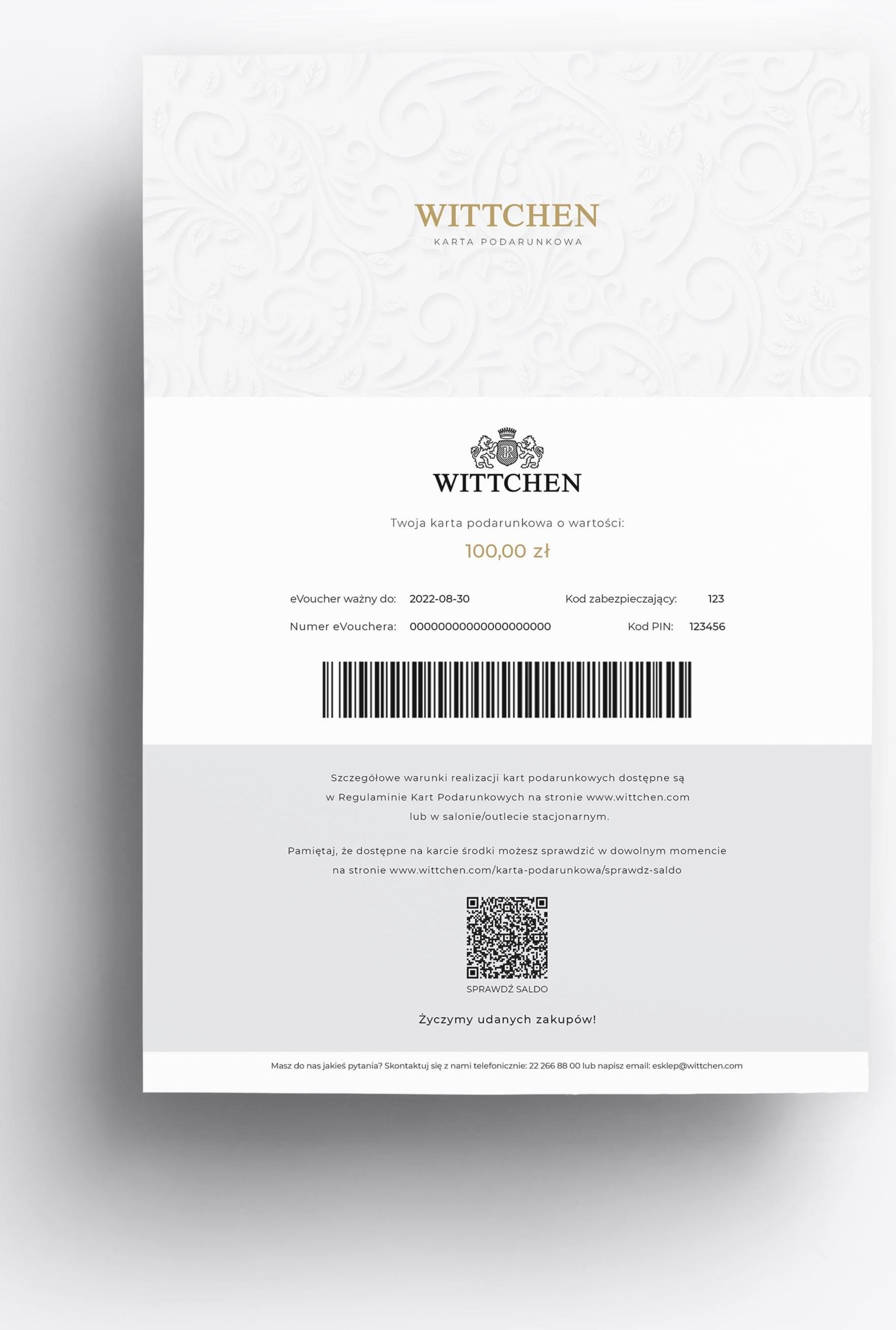 Karta podarunkowa: luksusowy prezent w ozdobnej odsłonie Podaruj niezapomniany prezent! Nasza karta podarunkowa WITTCHEN to doskonały sposób, by obdarować bliską osobę luksusowym doświadczeniem wyboru. Z ozdobnym wzorem, karta otwiera drzwi do świata wyjątkowych produktów, które odpowiadają gustowi i osobowości obdarowanej osoby. Idealna na każdą okazję, daje pełną swobodę wyboru, a Ty zyskujesz pewność, że prezent będzie trafiony. Z jakiej okazji? Nasza karta to idealny wybór na każdą wyjątkową chwilę - czy to urodziny, rocznicę, Święta Bożego Narodzenia, walentynki, czy po prostu chęć wyrażenia swojej troski i uznania. Karta podarunkowa WITTCHEN — jak to działa? Szybko i wygodnie na e-mail - Wybierz wartość, podaj adres e-mail i opłać zamówienie - to wszystko! Kartę podarunkową online otrzymasz w pliku PDF, a obdarowana osoba wykorzysta ją na www.wittchen.com lub w salonach stacjonarnych w całej Polsce. Elastyczność płatności - Jeśli wartość zakupów przekroczy kwotę karty, różnicę łatwo dopłacisz inną metodą płatności. Wielokrotne użycie - Karta może być używana, aż do wyczerpania dostępnych środków! Dostosuj wartość prezentu do okazji - Wybierz kwotę od 100 zł do 1000 zł - idealną na drobny upominek lub wyjątkowy prezent. Pełny rok na wybór idealnego upominku - Termin ważności karty upływa po12 miesiącach(1 rok) od daty zakupu. Łatwe zakupy online - Dodaj produkty do koszyka, wpisz kod karty podarunkowej i ciesz się zniżką przy finalizacji zamówienia. Zakupy w salonach stacjonarnych - Wystarczy pokazać kartę, a sprzedawca zeskanuje kod i pomniejszy wartość zakupów o dostępną kwotę na karcie. Potrzebujesz więcej informacji? Szczegółowe informacje znajdziesz tutaj. Jeżeli chcesz sprawdzićsaldo swojej karty, kliknij tutaj. Masz dodatkowe pytania? Skontaktuj się z nami. Pomożemy! Podaruj kartę podarunkową WITTCHEN- klucz do świata elegancji i wyjątkowych chwil!