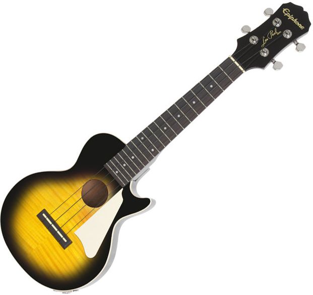 Epiphone Les Paul Acoustic/Electric Ukulele Outfit (Concert) Vintage Sunburst Epiphone produkuje gitary typu Les Paul nieprzerwanie od 1988 roku. Tym razem postanowił wykorzystać swoje doświadczenie, w celu stworzenia elektroakustycznego ukulele ze stylistyką utrzymaną w klimacie LP. Podobnie jak tradycyjny Les Paul Standarad, ukulele posiada lity mahoniowy korpus z klonowym topem, zapewniającym świetny wygląd oraz brzmienie. Mahoniowy gryf o profilu "D" jest przykręcony do korpusu przy pomocy 4 śrub. Instrument posiada palisandrową podstrunnicę (radius 16"), 21 progów oraz skalę 15". Ukulele brzmi świetnie akustycznie, zaś w przypadku podłączenia go do wzmacniacza, znakomite brzmienie przenosi układ oparty o wysokiej jakości przetwornik piezzo, umieszczony pod mostkiem. Klucze z przełożeniem 14:1 gwarantują idealne trzymanie stroju, zaś osłona pickguard zapewni długowieczność przepięknemu, klonowemu topowi. Instrument jest dostarczany z czarnymi, nylonowymi strunami oraz miękkim pokrowcem Epiphone. Specyfikacja techniczna: korpus: mahoń top: Laminowany klon płomienny gryf: mahoń, przykręcany profil gryfu: SlimTaper D skala: 15" podstrunnica: palisander progi: 19 binding: 1-warstwowy na korpusie szerokość siodełka 1 5/16" hardware: niklowany klucze: otwarte, przełożenie 14:1 przetwornik przy mostku: umieszczony pod siodełkiem, Piezo Film kontrola: pasywna mostek: palisander, siodełko z PVC kolor: Heritage Cherry Sunburst (HS) pokrowiec w zestawie