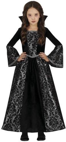 Strój Renesansowa Dama Dworu/Wampirzyca dla dziewczynki Przenieś swoją małą księżniczkę w świat historycznych dworów lub mrocznych opowieści z niezwykle wszechstronnym strojem Renesansowej Damy Dworu/Wampirzycy! Ten wyjątkowy kostium sprawdzi się doskonale zarówno na Halloween, jak i na Andrzejki czy inne przyjęcia tematyczne, a dzięki odpowiednim dodatkom może zyskać zupełnie różny charakter. Strój to długa, czarna suknia ozdobiona eleganckim, srebrno-czarnym nadrukiem, który podkreśla jej majestatyczny styl. Rozszerzane rękawy dodają sukni wyjątkowej lekkości i dostojności, idealnie wpisując się w klimat renesansowej damy dworu. Wystarczy dodać odpowiednie akcesoria, aby Twoja córka wcieliła się w postać z królewskiego dworu. Ten sam strój, w połączeniu z mrocznymi dodatkami, może zmienić się w kostium wytwornej wampirzycy – idealny wybór na wieczory pełne magii i tajemnicy. Alternatywnie, strój może przybrać postać czarnej damy – intrygującej i eleganckiej postaci, idealnej na bal kostiumowy lub karnawał. Jeśli szukasz stroju na karnawał lub kostiumu na Halloween, który oferuje wiele możliwości interpretacji, strój Renesansowa Dama Dworu/Wampirzyca to idealne rozwiązanie. Niezależnie od okazji, ten kostium sprawi, że Twoja dziewczynka będzie wyglądać olśniewająco i tajemniczo!