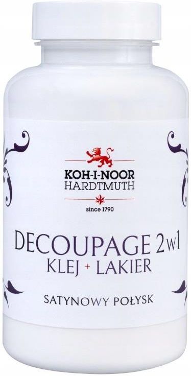 DEC-419780 KIN decoupage 2 w 1 klej lakier satynowy połyskKlej i lakier w jednym, idealny do techniki decoupage. Produkt przeznaczony jest do zabezpieczania i dekorowania różnorodnych powierzchni, takich jak szkło, drewno, gips czy papier.Główne zalety:Utrwala i zabezpiecza dekorowane …