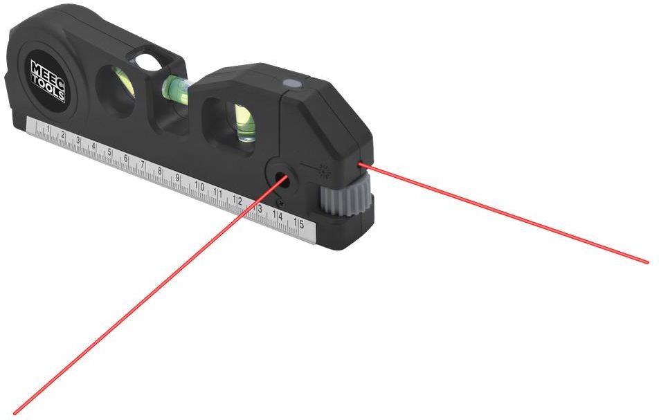 Przydatne narzędzie wielofunkcyjne z taśmą mierniczą, laserem krzyżowym i poziomicą Ręcznie regulowana wysokość. Zasilanie akumulatorowe.
