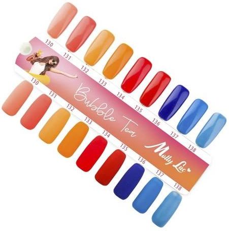 Wzornik MollyLac Bubble Tea połysk i mat 9 Kolorów Przedstawienie 9 kolorów kolekcji Molly Lac - BUBBLE TEA w połysku i macie. 130. Sweet Temptation - Pełen życia, energetyczny kolor rozbielonej, neonowej brzoskwini. Idealnie sprawdzi się w ciekawych pełnych rozmachu stylizacjach wakacyjnego looku. 131. Passion Fruit - Mocna wersja przyćmionej, brzoskwiniowej pomarańczy. Jeśli jesteś naładowana pozytywną energią wybierz ten kolor! 132. Tropical Maracuja - to piękny, morelowy odcień pomarańczu. Propozycja dla pełnych energii kobiet, które wiedzą czego chcą. 133. Pomarańcz z głębią - takie określenie idealnie pasuje do tego pięknego, neonowego oranżu! Rozpal zmysły z naszymi cudownymi kolorami z najnowszej kolekcji! 134. Redvolution - Intensywna, neonowa czerwień to absolutny must have tego sezonu. Zaskakująca i bardzo żywa propozycja dla wszystkich fashionistek. 135. Maroccan Dream - Perfekcyjna karminowa czerwień dla najbardziej wymagających klientek. 136. Vitality - Wyjątkowy, wyszukany kolor błękitu idealny dla pokreślenia wszelkiego typu wakacyjnych, wysmakowanych stylizacji. 137. Elixir - Ochłodzenie w gorący dzień ? z tym kolorem wszystko jest możliwe. Wyrazisty, niebieski odcień z którym z pewnością będziesz na fali. 138. Mystery Puff - Cudowny, delikatnie rozbielony odcień pacyficznego błękitu. Nieoczywisty charakter i smak dla każdej z nas!