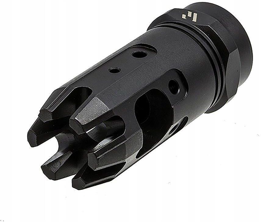 Kompensator Strike Industries Mini King Comp do karabinków w kalibrze 9 mm (20461) SP Wyprodukowany przez firmę Strike Industries kompensator przeznaczony do karabinków w kalibrze 9 mm z gwintem 1/2 x 28. Mini King Comp został wykonany ze stali i pokryty ochronną powłoką. Kompensator charakteryzuje dwukomorowa konstrukcja aby maksymalnie zredukować odrzut, a pięć ustawionych pod kątem otworów skutecznie stabilizuje lufę. Dodatkowo na froncie umieszczono ponacinane zęby odpowiadające za redukcję błysku wystrzału. W komplecie stalowa podkładka (Crush Washer). Kompensator Mini King Comp jest kompatybilny z urządzeniami wylotowymi Strike Industrie Oppressor. Dane techniczne Kolor: czarny Materiał: stal Średnica zewnętrzna: 22 mmm Długość: 58,5 mm Gwint: 1/2 x 28 Waga: 96 g Producent: Strike Industries