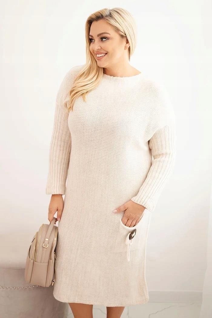 Sukienka swetrowa damska Plus Size z moherem oversize z kieszenią beżowa Konstantynów Łódzki