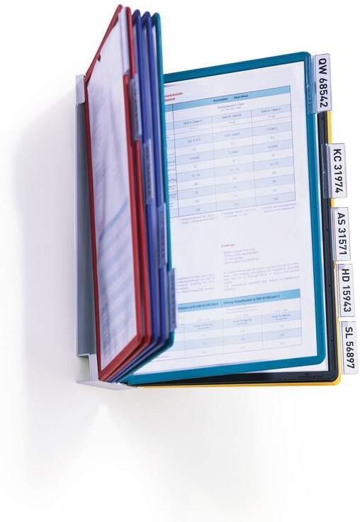 Moduł naścienny z metalu z kolorowymi panelami z polipropylenu, indeksy. Przeznaczony szczególnie do warsztatów, sal sprzedażowych i ekspozycyjnych. Zastosowanie bolców gwarantuje łatwe wyjmowanie i wkładanie paneli do modułu. obszerny naścienny zestaw prezentacyjny uchwyt naścienny z 10 panelami prezentacyjnymi SHERPA w formacie A4, po 2 sztuki w kolorze czarnym, czerwonym, żółtym, zielonym i granatowym panele prezentacyjne wykonane z polipropylenu, z kolorową ramką i folią nadającą się do skanerów dzięki niewielkiemu współczynnikowi odbicia światła produkt jest wyposażony w zakładki indeksujące z pustymi wkładami do opisu paneli łatwy montaż naścienny praktyczny mechanizm sworzniowy zapewnia łatwą wymianę paneli 5 lat gwarancji