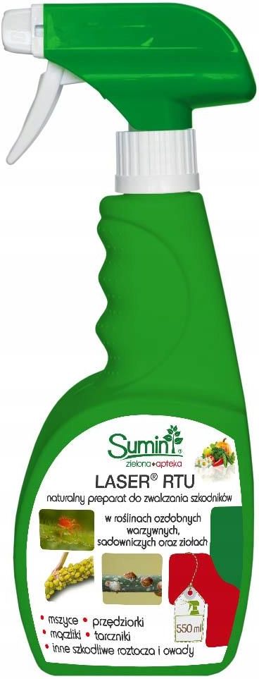 SUMIN LASER RTU GOTOWY DO UŻYCIA Opakowanie: 550ml Preparat pochodzenia naturalnego Laser RTU, zawierający w swoim składzie olej roślinny, w formie koncentratu do sporządzania emulsji wodnej, o działaniu kontaktowym. Działając w sposób mechaniczny, przeznaczony jest do ochrony roślin sadowniczych, ozdobnych, warzywnych, ziół przed tarcznikami, mszycami, przędziorkami, mączlikami, miodówkami, wełnowcami oraz innymi roztoczami i owadami w uprawie polowej i pod osłonami. Może być stosowany w uprawach domowych , ogrodowych i pod osłonami. Stosowany wczesną wiosną ogranicza występowanie form zimujących niektórych szkodników. DZIAŁANIE Pokryte cieczą przędziorki i inne roztocza oraz szkodliwe drobne owady tracą możliwość oddychania, poruszania się i żerowania, co prowadzi do nieuchronnej śmierci. Jednocześnie produkt nie wywołuje żadnych negatywnych skutków dla chronionej rośliny. Preparat ze względu na odmienny mechanizm działania niż chemiczne środki ochrony roślin nie powoduje uodpornień. Butelka posiada podwójne zabezpieczenie przed dziećmi. SPOSÓB UŻYCIA: Przed zastosowaniem środka kilka razy wstrząsnąć opakowaniem. Za pomocą spryskiwacza nanosić preparat w miejsca występowania szkodników. Należy zadbać o dokładną, staranną aplikację, ze szczególnym uwzględnieniem dolnej strony liści. Unikać stosowania środka powyżej temperatury 25°C. Spryskiwać suche rośliny w okresach bezsłonecznej pogody. Warunki pogodowe muszą zapewnić wyschnięcie cieczy na roślinach w ciągu 3 godzin. Produktu nie należy łączyć ze zwilżaczami, gdyż sam produkt pełni tę rolę i jest odporny na zmywanie przez deszcz. Bardzo dobre efekty powoduje stosowanie produktu w regularnych np. 7-dniowych odstępach czasu. Ze względu na możliwość powstania zabrudzeń typowych dla oleju, podczas stosowania w domu należy zwrócić uwagę na zabezpieczenie znajdujących się w bezpośredniej bliskości przedmiotów/ścian. Substancja czynna: naturalny olej roślinny pochodzący z lnicznika siewnego (Caamelia sativa). Pełna informacja o preparacie znajduje się w etykiecie - instrukcji stosowania środka ochrony roślin dołączonej do każdego opakowania. Przed użyciem zapoznać się z etykietą. Stosować zgodnie z instrukcją dołączoną do opakowań jednostkowych. Środki ochrony roślin do użytku profesjonalnego mogą być nabyte tylko i wyłącznie przez osoby pełnoletnie oraz posiadające kwalifikacje wymagane od osób nabywających środki ochrony roślin określone w ustawie (art. 28 Ustawy z dnia. 8 marca 2013 r. o Środkach Ochrony Roślin Dz.U.2018 poz.1310 z późn. zm.). Dokonując zakupu kupujący oświadcza, że zapoznał się z powyższą treścią i spełnia warunki zawarte w art. 28 Ustawy z dnia. 8 marca 2013 r. o Środkach Ochrony Roślin (Dz.U.2018 poz.1310 z późn. zm.), a ponadto wyraża zgodę na przesyłanie faktur w formie elektronicznej zgodnie z art. 106n ustawy z dn. 11 marca 2004 r. o podatku od towarów i usług (Dz. U. z 2020 r. poz. 106 z późn. zm.) W celu umożliwienia właściwego wykonywania przez Sprzedającego obowiązków wynikających z art.25 ust 3 pkt 4 Ustawy z dnia 8 marca 2013r o środkach ochrony roślin (Dz.U.2020 poz 2097 z późn. zm.) - zwanej dalej Ustawą - wymaga się aby Kupujący, który nie jest Ostatecznym nabywcą środków ochrony roślin w rozumieniu art. 2 ust. 1 pkt 19 Ustawy, zgłosił Sprzedającemu przed finalizacją zakupu fakt, że nie jest on Ostatecznym nabywcą środków ochrony roślin w rozumieniu art. 2 ust. 1 pkt 19 Ustawy. Tylko w wypadku dokonania powyższego zgłoszenia Sprzedający wystawi dokument "Specyfikacja dostawy" do Zakupu który zawierać będzie szczegółowe informacje o datach produkcji i numerach partii zbywanych (nabywanych) środków ochrony roślin lub umieści te informacje bezpośrednio na fakturze. W przypadku braku zgłoszenia powyższego faktu Kupujący traktowany jest jako Ostateczny nabywca środków ochrony roślin w rozumieniu art. 2 ust. 1 pkt 19 Ustawy. Produktów biobójczych należy używać z zachowaniem środków ostrożności. Przed każdym użyciem należy przeczytać etykietę i informacje dotyczące produktu- zgodnie z Rozporządzenie 528/2012 nr art. 72 w sprawie udostępniania na rynku i stosowania produktów biobójczych.