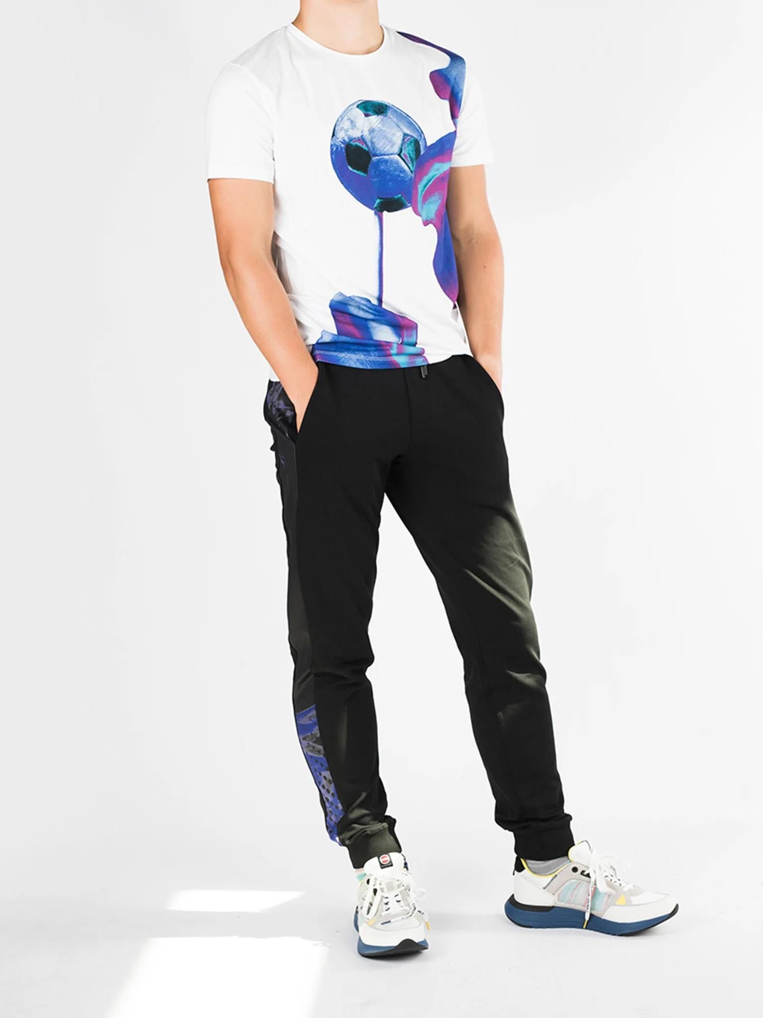 Prosty fason Zwężane nogawki W pasie wszyta guma, dodatkowo regulowane sznurkiem Z przodu dwie z tyłu jedna wpuszczone kieszenie Ozdobione kolorowymi panelami Z przodu nadruk 3d z firmowym logo Nogawki zakończone ściągaczem Wykonane z wysokiej jakości materiałów Wyprodukowano we Włoszech