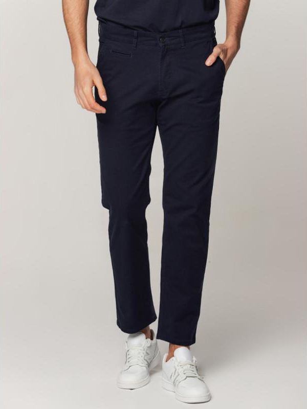 Klasyczne spodnie męskie typu Chino z dwiema ukośnymi kieszeniami z przodu i dwiema wypuszczanymi z tyłu. Posiadają brązowe obszycia tylnych kieszeni i małej kieszonki z przodu. Cechują się przewiewnością i wytrzymałością. Wysoka jakość tkaniny bawełnianej z dodatkiem elastanu zapewnia komfort noszenia w każdej sytuacji. Kolor: ciemnogranatowe o gładkiej fakturze Skład: 98% bawełna, 2% elastan Sylwetka: klasyczna (regular) Kieszenie: dwie z przodu, dwie z tyłu Jakość: pierwsza Producent: Willsoor Gwarancja: 24 m-ce Model ma 192 cm wzrostu.