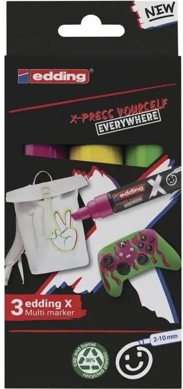 MULTI MARKER E-6900 EDDING, CUKIERKOWE KOLORY, ZESTAW 3 SZT. multi marker do personalizacji przedmiotów takich jak odzież, trampki, plecaki, deskorolki, notesy i inne co najmniej 96% zatyczki i obudowy wykonano z plastiku pochodzącego z recyklingu (pokonsumenckiego) ścięta końcówka o grubości 2-10 …