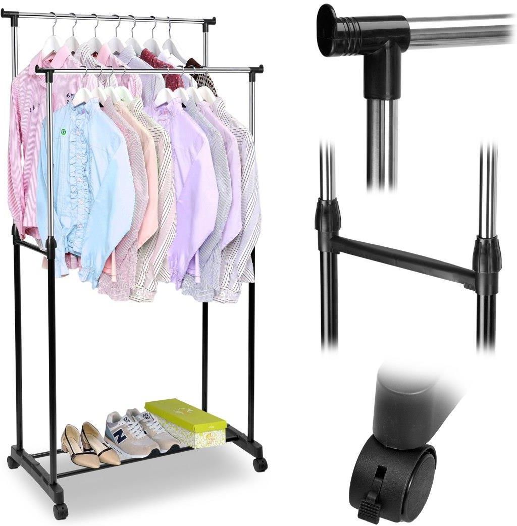 Wieszak stojący podwójny na kółkach WALERIA ⭐️ Regulacja wysokości ⭐️ Dwa drążki na wieszaki ⭐️ Półka na buty ⭐️ Solidna stalowa konstrukcja ⭐️ Zakup od producenta Wieszak WALERIA - styl, wygoda i funkcjonalność w jednym✨ Szukasz praktycznego rozwiązania na przechowywanie odzieży i butów w jednym …