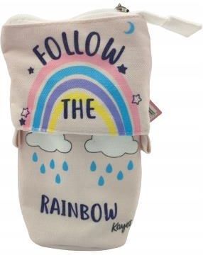 Podążaj za tęczą Piórnik posiada twarde dno, dzięki czemu można używać go jako organizer na biurko czy szkolną ławkę. Po zsunięciu górnej części z łatwością wyjmiemy szkolne artykuły, bez bałaganu. Jest praktyczny i nie zabiera dużo miejsca w plecaku.