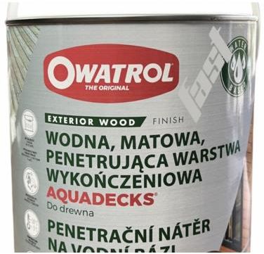 AQUADECKS - olej do deski tarasowej i architektury ogrodowej Wydajnośc praktyczna: 5m2/l / Wydajnośc przy konserwacji: 10-12m2/l Temperatura aplikacji: 10˚C do +30˚C Czas schnięcia: 4h OWATROL AQUADECKS Wodny akrylowo-alkidowy saturator, który nadaje matowy efekt końcowy, o dobrze pracującej powłoce wierzchniej. Zalecany do wszystkich gatunków drewna, jak również dla drewna egzotycznego. Zastosowanie AQUADECKS'u zmniejsza efekty niszczenia drewna wywołane wilgocią i promieniami słonecznymi, a także hamuje procesy kurczenia i zmniejsza podatność na pękanie. Możemy nakładać na wszystkie miejsca drewniane pionowe, jak też poziome. Dzięki procesom wnikania przedłuża ochronę drewna. Dodatkowo jest to środek bezpieczny dla środowiska. WŁAŚCIWOŚCI Do stosowania bezpośrednio na nowe i sezonowane drewno Łatwy w użyciu - Łatwy w aplikacji Nie tworzy warstwy filmu - Bez odchodzenia i łuszczenia Doskonała odporność na warunki atmosferyczne Na powierzchnie pionowe i poziome: tarasy, meble, fasady... Doskonała odporność na UV Delikatny zapach. Szybko schnie. Łatwy w konserwacji. Bez szlifowania, bez zdzierania. GDZIE STOSOWAĆ Do stosowania na zewnątrz i wewnątrz Drewno tropikalne: Teak, Ipe, Cumaru, Bangkirai, Movingui, Massaranduba... Drewno miękkie: Świerk, Cedr, Brzoza, Sosna, impregnowane ciśnieniowo... Termo drewno oraz Buk, Dąb, Jesion, Klon... Bezpośrednio na przygotowane drewno ZALECENIA PRZED APLIKACJĄ Powierzchnia musi być czysta, sucha i wolna od oleju, tłuszczu, pleśni, uprzednich warstw i jakichkolwiek innych zanieczyszczeń. Drewno musi być suche (max. 18% wilgotności) Nie nakładać w bezpośrednim słońcu i na gorące powierzchnie. Nie nakładać gdy spodziewane jest ochłodzenie/deszcz w przeciągu 12 dni od aplikacji. Uważać na wczesnoporanną wilgoć. Osłonić wszystkie powierzchnie kttóych nie chcemy zabezpieczyć. Upewnić się, że powierzchnia nie ma warstw zabezpieczających stosowanych podczas produkcji drewna. Zalecenie OWATROL: niektóre, niezabezpieczone gatunki drewna miękkiego mogą wymagać uprzedniego zasosowania Sanixyl w celu ochrony przed grzybami i niebieskimi plamami.