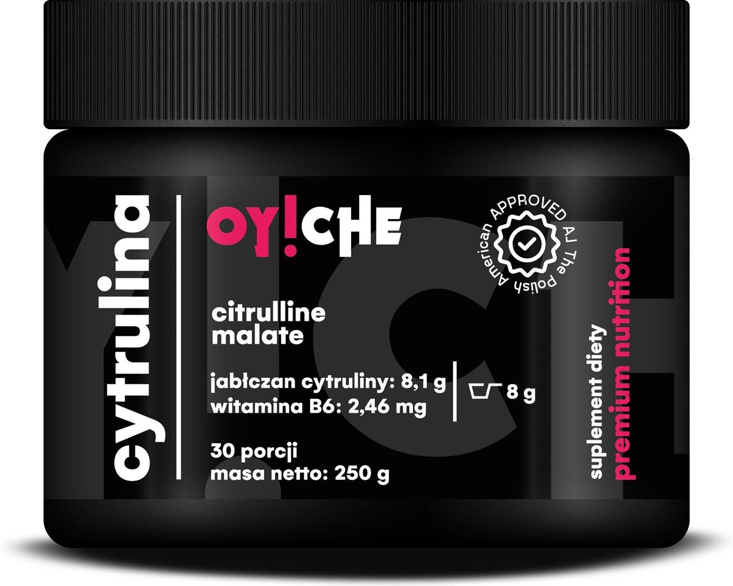 OY!CHE CYTRULINA – moc i wytrzymałość na wyciągnięcie rękiOY!CHE CYTRULINA to wysokiej jakości jabłczan cytruliny z dodatkiem witaminy B6, stworzony specjalnie dla osób aktywnych fizycznie. Dostępny w trzech wariantach: bez smaku, soczysty ananas i wiśnia, w praktycznym opakowaniu 250 g. To suplement, który pomoże Ci wycisnąć maksimum z każdego treningu.Jak działa OY!CHE CYTRULINA?Cytrulina przekształca się w argininę – prekursor tlenku azotu (NO), który rozszerza naczynia krwionośne i poprawia