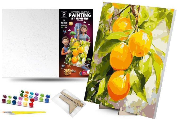 Malowanie po numerach Soczyste Cytryny 40x50 cm Qbee ✅ ✔️ Zestaw do malowania po numerach składa się z zagruntowanego płótna artystycznego na blejtramie, zestawu wysokiej jakości farb akrylowych odpornych na ścieranie i przypalanie o pojemności 2,5 ml 9% każda, nylonowych pędzli różnej wielkości, …