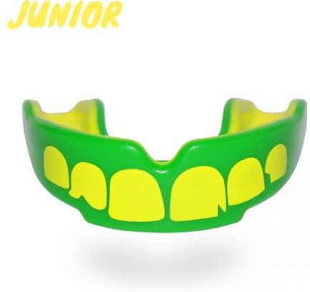 Ochraniacz na Zęby SafeJawz JUNIOR Konstrukcje ochraniaczy szczęk Safe Jawz i materiały z których są wykonane umożliwiają użytkownikowi bardzo dokładne dopasowanie ochraniaczy do uzębienia w czasie krótszym niż 10 minut, a także umożliwiają wielokrotną korektę dopasowania , nieporównywalną do zwykłych ochraniaczy szczęk ich ochronę a przy tym są bardzo efektowne wizualnie. Zawodnicy oraz fani lubią się wyróżniać i chętnie wybierają te szczęki do noszenia.Ochraniacze szczęk Safe Jawz składają się z podwójnych warstw ochronnych zespolonych ze sobą i doskonale pochłaniających energię uderzenia , posiadają 3 opatentowane systemy FluidFit , JawSecure i RemodelTech. Pierwszy system dzięki płynnemu składnikowi materiału służy bardzo dokładnemu uformowaniu się ochraniacza i dopasowaniu go do uzębienia, drugi zapewnia lepsze pochłonięcie energii poprzez specjalnie zaprojektowane zaciski między dwoma warstwami ochraniacza a trzeci umożliwia użytkownikowi ponowne umodelowanie ochraniacza jeśli przy jego formowaniu niedokładnie dokonał zgryzu i istnieje konieczność poprawienia modelingu ochraniacza. Ochraniacze Safe Jawz są zapakowane w indywidualne i estetyczne etui. Przeznaczenie: Dla Dzieci do 11 lat