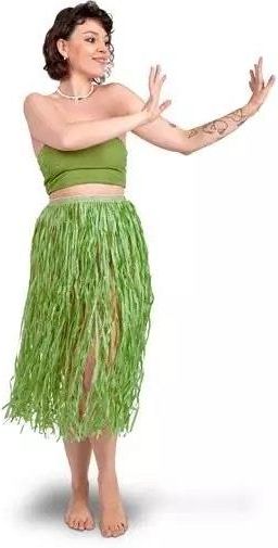 Spódnica hawajska z rafii w kolorze zielonym. Rozmiar uniwersalny dla dorosłych. Spódnica ma elastyczną gumkę w pasie. Wymiary produktu: długość 77 cm, szerokość w pasie 31,5 cm Format: 455x225 mm