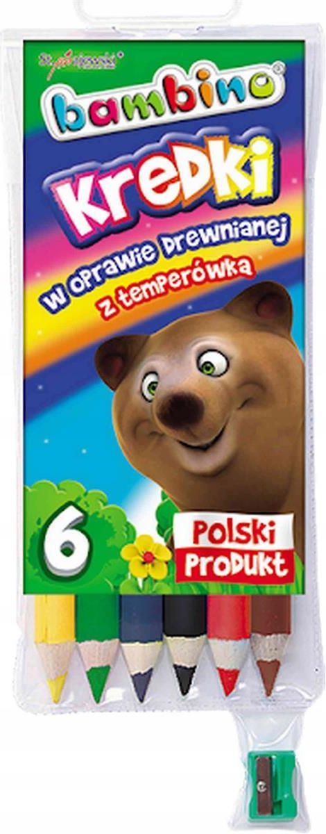Wysokiej jakości kredki z glinki kaolinowej w drewnianej oprawie. Charakteryzują się wyjątkowo intensywnymi i nasyconymi kolorami. Doskonale kryją, idealnie nadają się do rysowania, wypełniania dużych powierzchni i wykonywania miękkich przejść pomiędzy kolorami. Kredki są grube, odpowiednio wyważone, przez co idealnie dopasowują się do małej dłoni dziecka. Produkowane są w Polsce, w zgodności z dyrektywą Parlamentu Europejskiego i Rady w sprawie bezpieczeństwa zabawek oraz rozporządzeniem Ministerstwa Gospodarki w sprawie zasadniczych wymagań dla zabawek, co gwarantuje bezpieczeństwo kredek Bambino. Licencja - Bambino, ilość kolorów - 6, ilość sztuk w opakowaniu - 6, cechy szczególne - kredki o przekroju 7 mm z temperówką w zestawie. Uwaga! Mix wzorów opakowań, wysyłane losowo. Stan: Nowy EAN: 5903235000232 Kod producenta: 5903235000232 Marka: Bambino Rodzaj: kredki grafionowe Bohater: brak Kolor: Wielokolorowy Płeć: Chłopcy, Dziewczynki Liczba sztuk w zestawie: 6