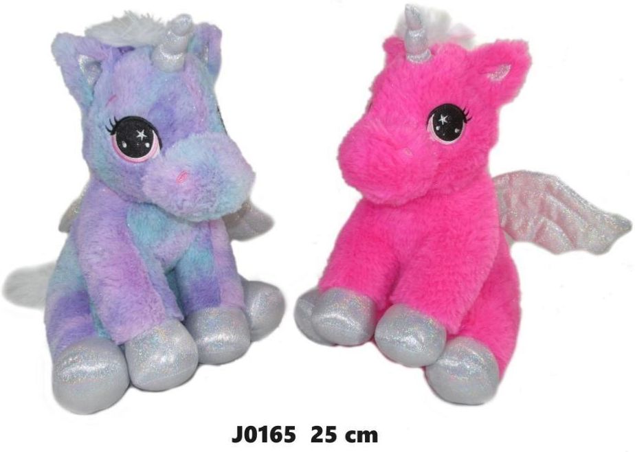 Pluszowy jednorożec to doskonały towarzysz do zabawy i przytulania dla każdego dziecka. Pluszak pokryty jest niezwykle przyjemnym w dotyku materiałem imitującym futerko i wypełniony miękkim pluszem. Jego piękne oczy z dodatkiem błyszczącego brokatu oraz mieniący się róg, skrzydła i kopytka z pewnością zachwycą i przyciągną uwagę najmłodszych. Jednorożec występuje w pozycji siedzącej i samodzielnie potrafi utrzymać równowagę. Wiek: 0-3