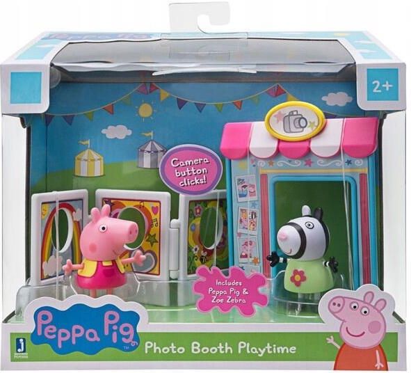 Świnka Peppa - Zabawa w Fotobudce Zrób zabawne zdjęcia razem z Peppą i swoją najlepszą przyjaciółką Zoe Zebra w pudełku na zdjęcia. Wybierz, czy wolisz zrobić zdjęcie motywem tęczy, kwiatów lub muzycznym. Zestaw do gry Fotobox zawiera dwie ekskluzywne figurki, figurki Peppa Pig i Zoe Zebra oraz pudełko na zdjęcia i składaną ścianę z 3 różnymi motywami. Zestaw do gry jest idealnie skalowany, aby grać w inne zestawy do gry Peppa Pig i pojazdy Wspaniałe rozszerzenie świata Peppa Pig. Nadaje się dla dzieci w wieku od 2 lat.