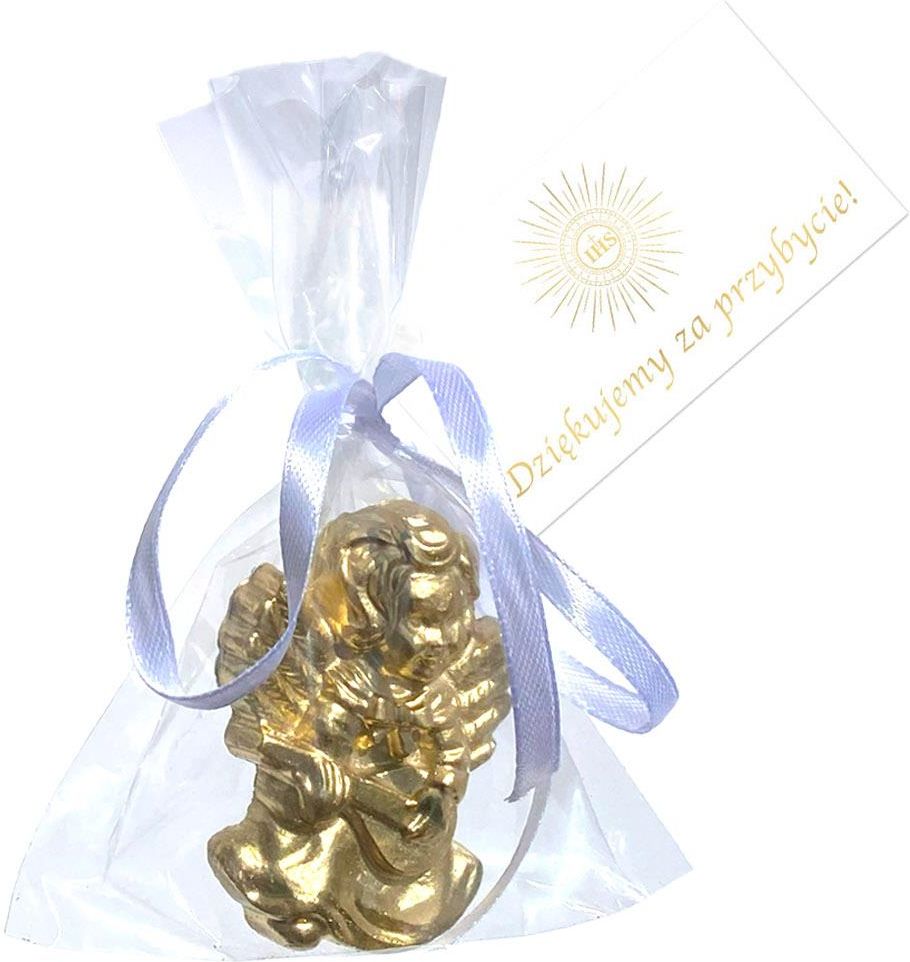 Aniołek gipsowy w kolorze złotym. Idealny prezent i podziękowanie gościom za przybycie na uroczystość I Komunii świętej, chrztu czy ślubu. W skład kompletu do stworzenia podziękowania: - aniołek gipsowy 7x5 cm - woreczek - tasiemka - karteczka.
