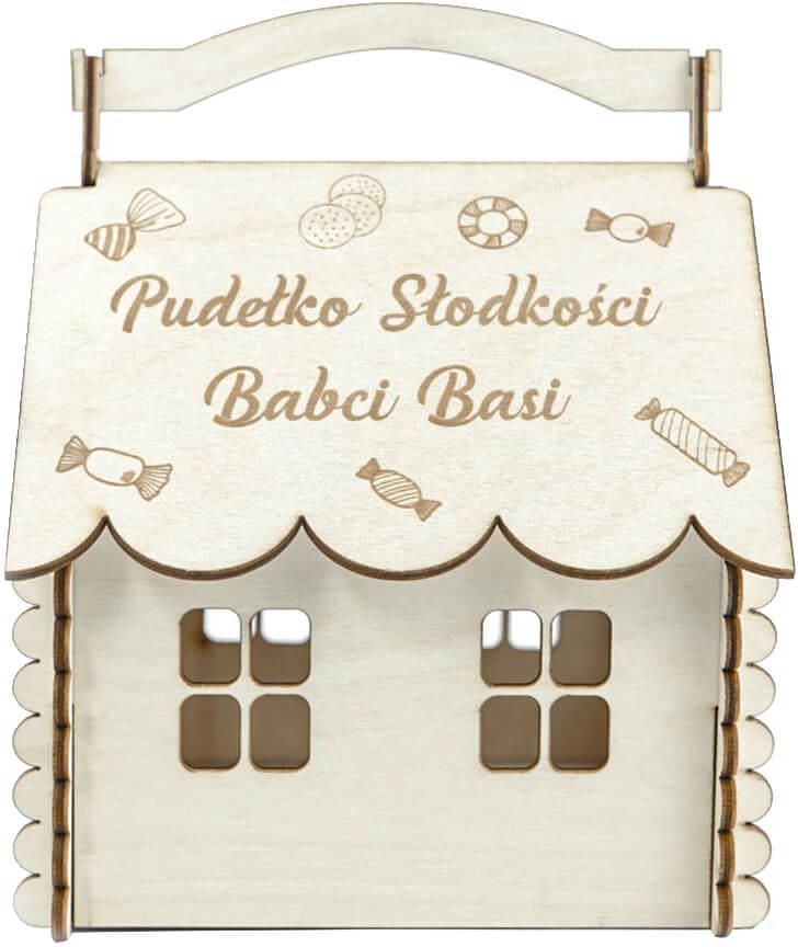 Drewniany domek na słodycze, cukierki lub inne upominki na Dzień Babci. Na dachu domku widnieje grawer "Pudełko słodkości Babci..." + imię. Imię do personalizacji prosimy podać w notatce do zamówienia. Wymiary domku: wys. 16 cm x szer. 13 cm x gł. 14 cm.
