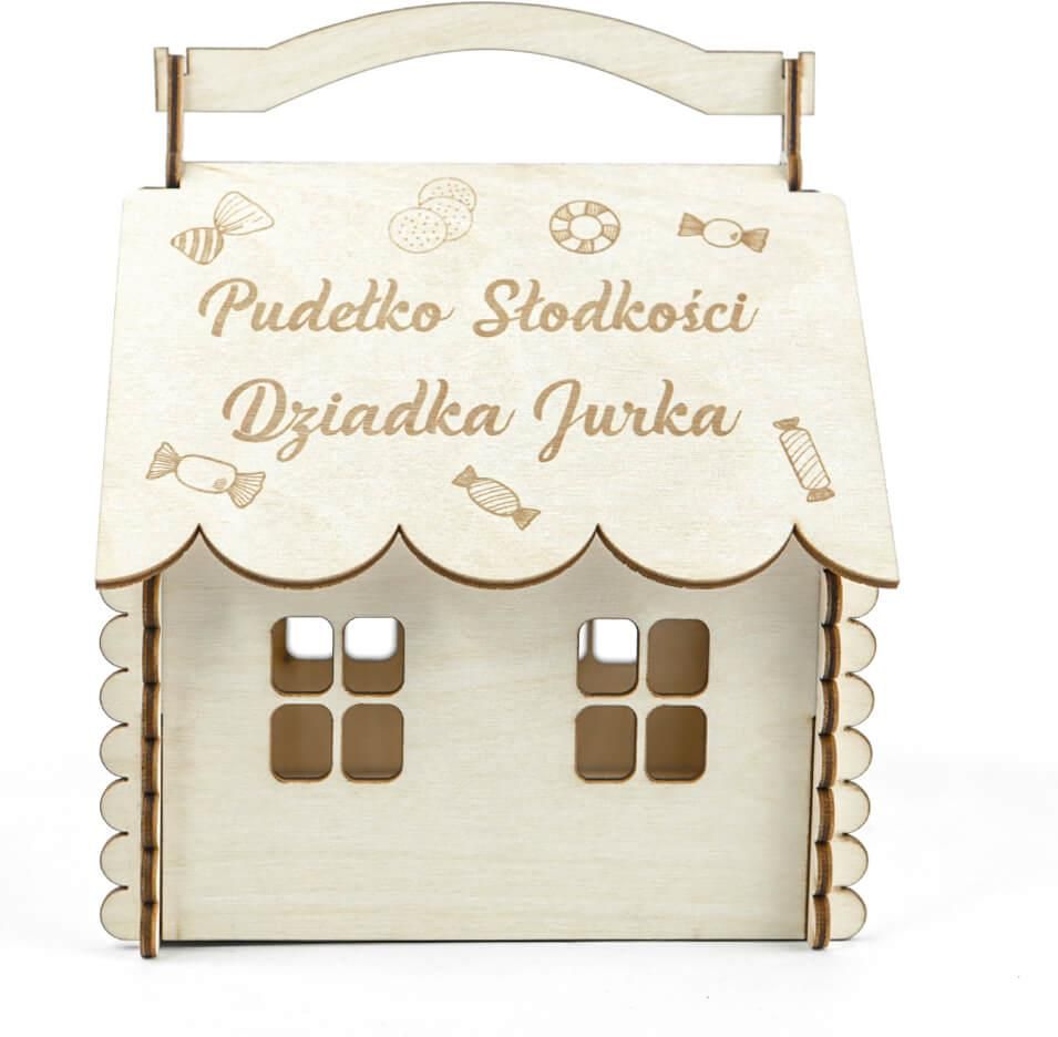 Drewniany domek na słodycze, cukierki lub inne upominki na Dzień Dziadka. Na dachu domku widnieje grawer "Pudełko słodkości Dziadka..." + imię. Imię do personalizacji prosimy podać w notatce do zamówienia.
