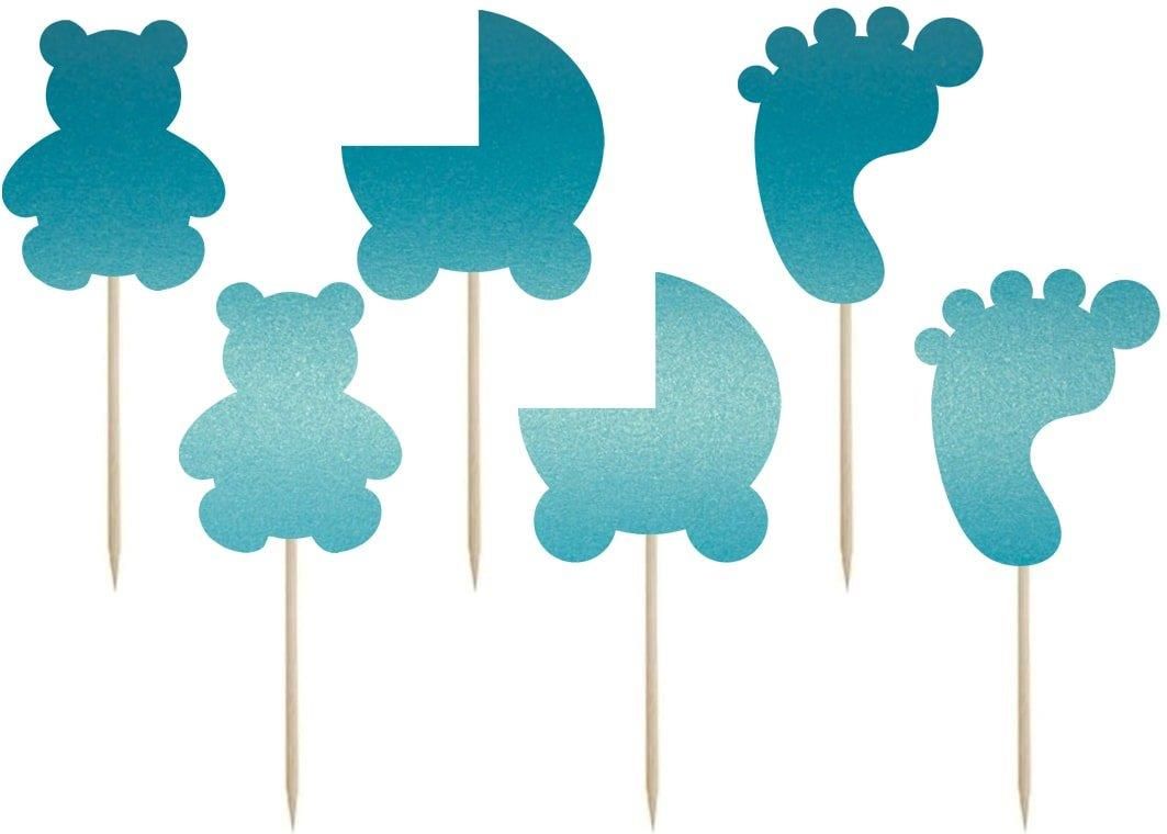 Papierowe dekoracje z różnymi wzorami na baby shower lub roczek, idealna dekoracja tortu, babeczek i muffinek. Wysokość patyczka: 6,5 cm, Rozmiar wzoru: ok 4 cm Kolor: błękitny. Opakowanie: 6 szt.
