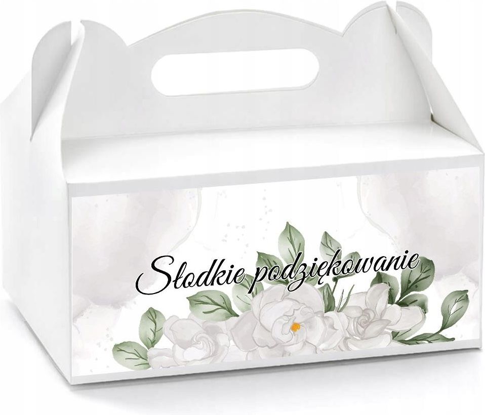 Pudełka na ciasto z kwiatami - 6 szt. Kod produktu: PUDCS-WES46 Zestaw pudełka białe na ciasto z naklejkami ślubnymi w motywie białych kwiatów. Naklejki do samodzielnego przyklejenia. Wymiarami dopasowane do dłuższego boku pudełka. Rozmiary po złożeniu: długość 19 cm, szerokość 14 cm, wysokość 9 cm. Produkt posiada atesty do kontaktu z żywnością. Opakowanie: 6 szt.