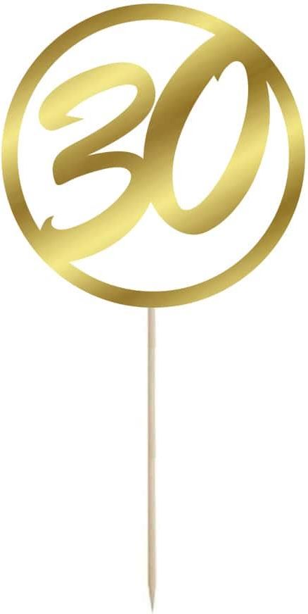 Topper z liczbą 30 w okręgu w kolorze złotym na piku, idealna dekoracja tortu na 30 urodziny. Dekoracja DIY. Średnica: 10 cm. Patyczek 11 cm. Opakowanie: 1 szt.