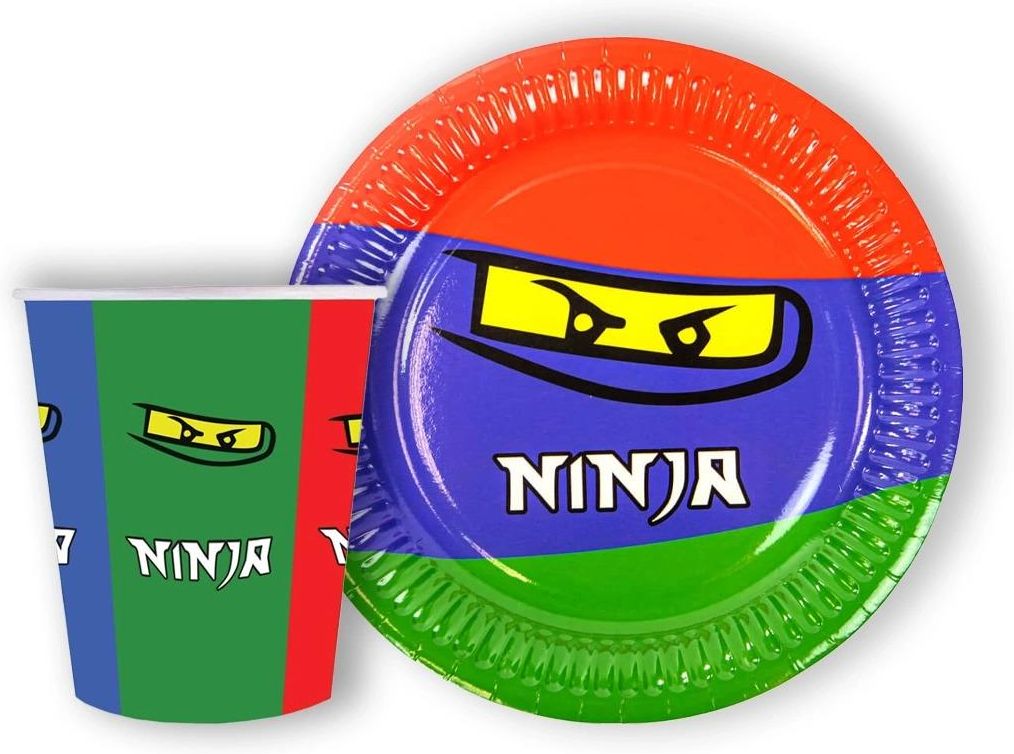 Papierowy zestaw urodzinowy Ninja. Stylem przypominają Ninjago. W komplecie: Kubeczki: - 250 ml - 12 szt. Talerzyki: - 18 cm - 12 szt. Opakowanie: 24 szt.