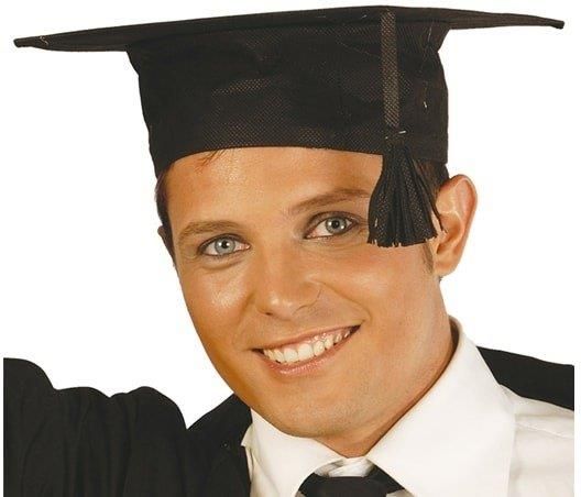 Czapka biret studenta. W kolorze czarnym. Z materiału przypominającego flizelinę. Kwadratowy daszek z kartonu. Rozmiar uniwersalny, obwód ok. 56 cm.