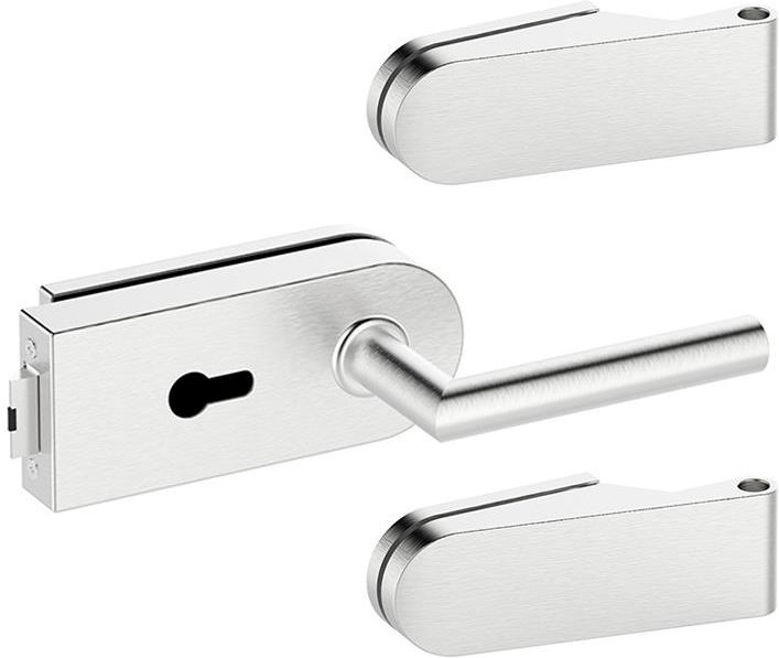 Komplet okuć do drzwi szklanych o grubości 8 mm. Na wkładkę. Stal nierdzewna AISI 304, wykończenie w kolorze inox. Drzwi o maksymalnych wymiarach: wys. 2000 mm; szer. 800 mm. Stronność: lewa / prawa. Zawiera: zamek, klamkę,2x zawiasy do szkła.