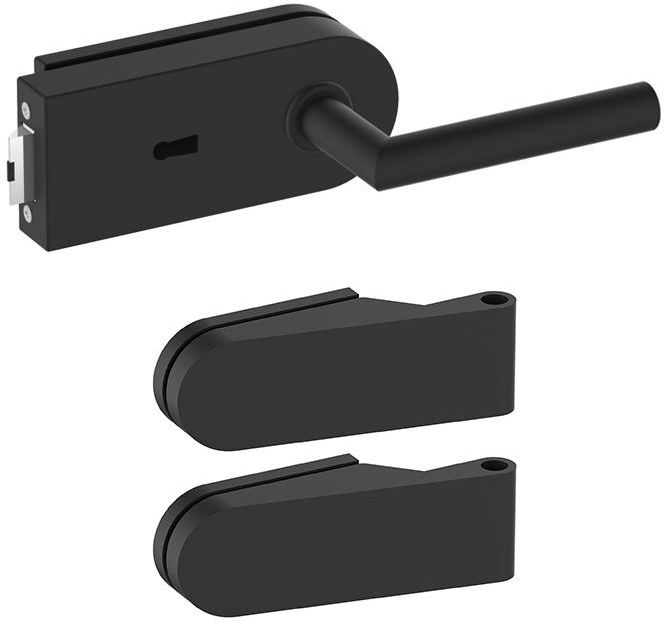 Komplet okuć do drzwi szklanych o grubości 8 mm. Na klucz. Stal nierdzewna AISI 304, wykończenie w kolorze czarnym. Drzwi o maksymalnych wymiarach: wys. 2000 mm; szer. 800 mm. Stronność: lewa / prawa. Zawiera: zamek, klamkę,2x zawiasy do szkła, klucze.