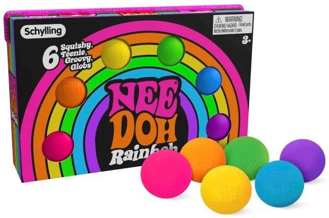 Teenie NeeDoh is the fun-sized Groovy Glob. This NeeDoh Rainbow pack includes a total of 6 differently colored Teenie NeeDohs that will help you relax all the way to your fingertips. Grab a Teenie NeeDoh and give it a squeeze. a poke. or a hug. It will quickly help you unwind. All Teenie NeeDohs are filled with a non-toxic. dough-like substance that always returns to its original shape. Suitable for ages 3 and up.