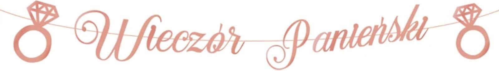 BANER WIECZÓR PANIEŃSKI RÓŻOWE ZŁOTO Baner z napisem "Wieczór Panieński" z dwoma pierścionkami wykonany z lustrzanego papieru w kolorze różowego złota. Wymiary napisu: wysokość 17 cm, długość 150 cm. Idealny dodatek do dekoracji na wieczór panieński. Na pozostałych naszych aukcjach oferujemy: różnego rodzaju gadżety i dekoracje na wieczór panieński: balony, welon, karty do gry. Baner wieczór panieński różowe złoto 150 cm