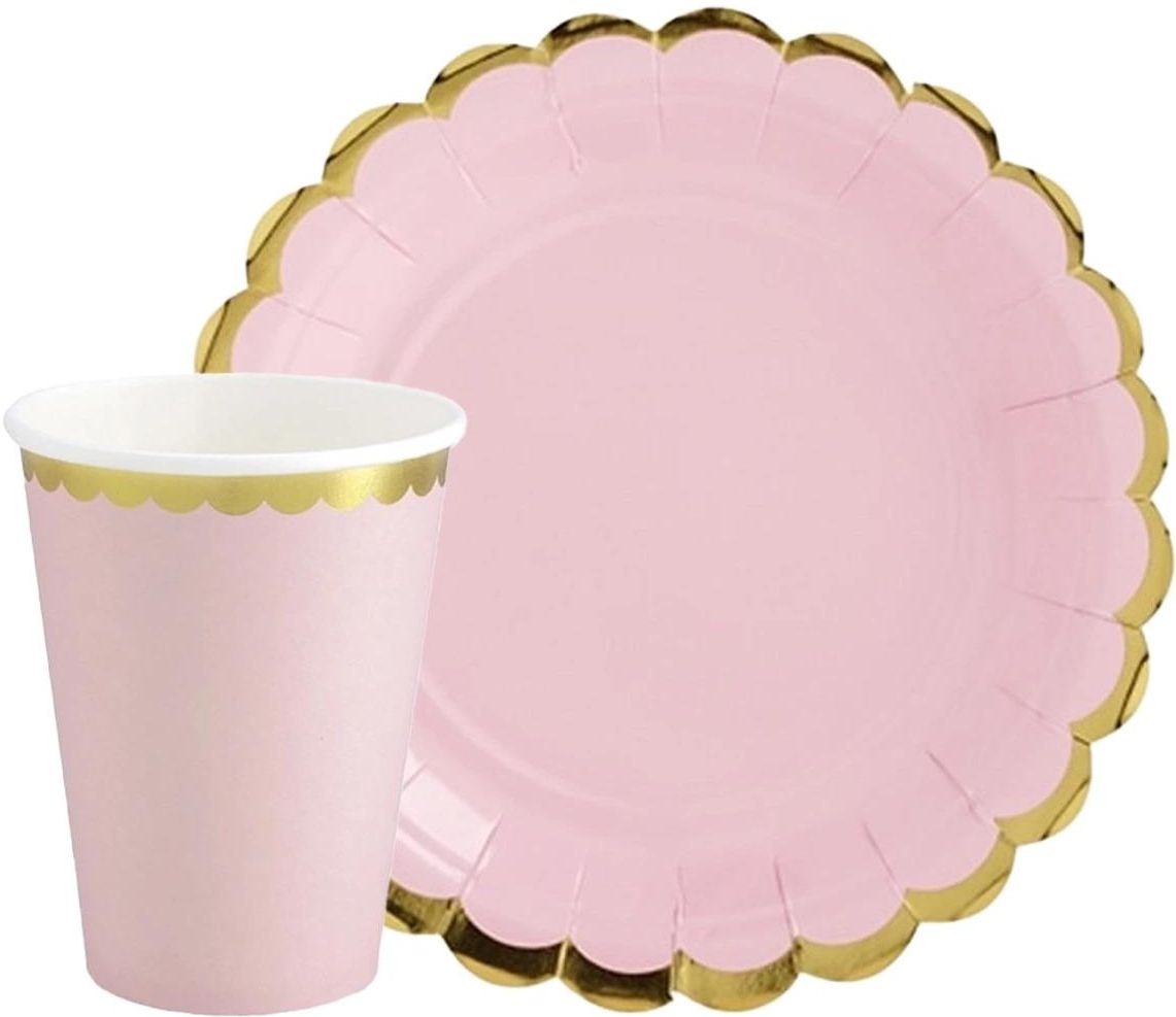 Papierowy zestaw urodzinowy w kolorze różowym ze złotym akcentem. W komplecie: Kubeczki: - 220 ml - 12 szt. Talerzyki: - 18 cm - 12 szt. Opakowanie: 24 szt.