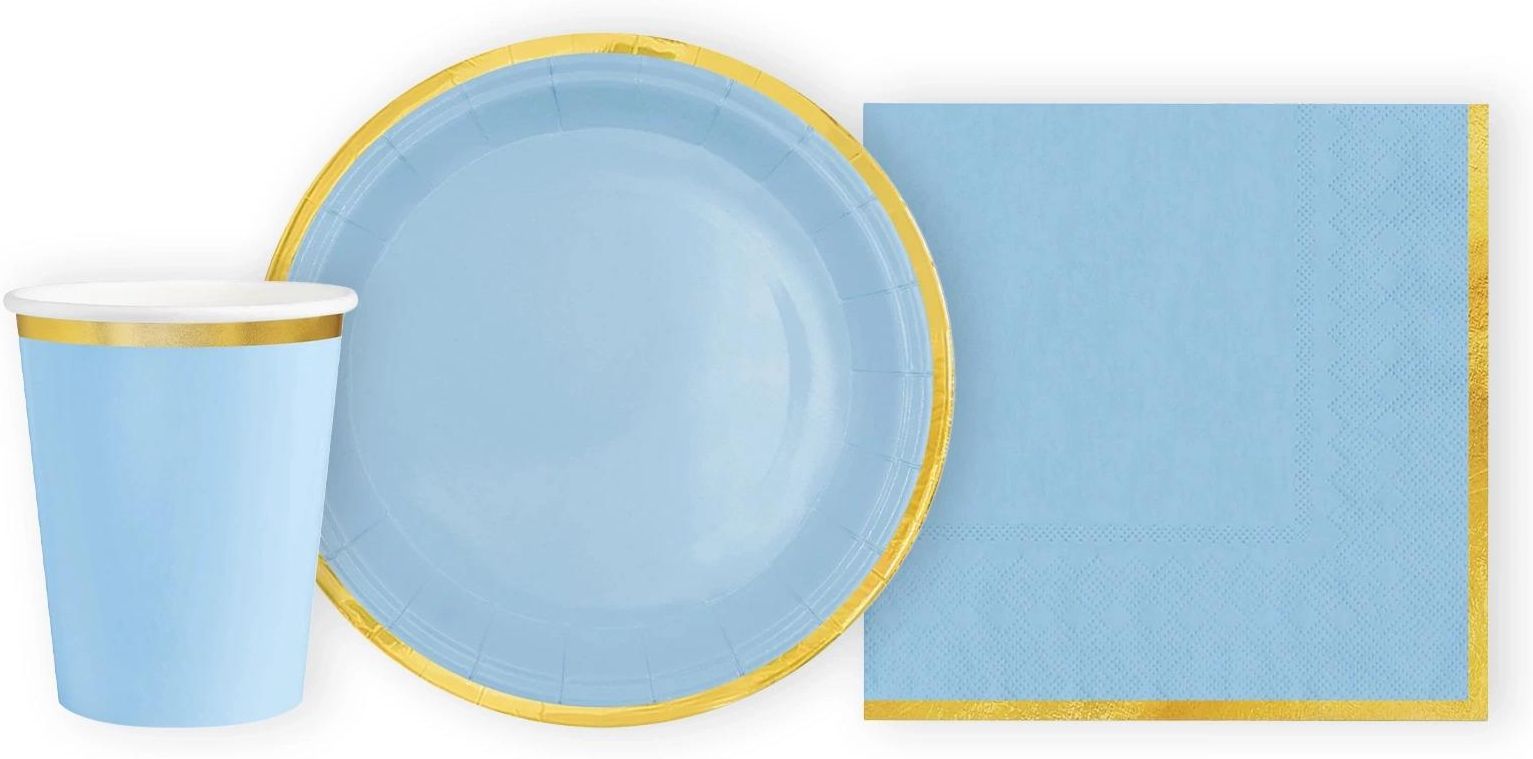 Niebieski zestaw papierowy ze złotą obwódką. Idealne na urodziny lub baby shower. W komplecie: Kubeczki: - 220 ml - 6 szt. Talerzyki: - 18 cm - 6 szt. Serwetki: - 33 cm - 10 szt. Opakowanie: 22 szt.