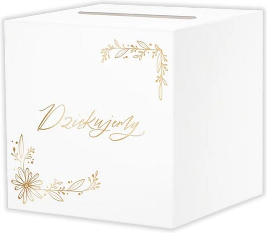 PUDEŁKO NA KOPERTY ŚLUBNE ZE ZŁOTYM NAPISEM DZIĘKUJEMY Pudełko na koperty ślubne Wymiary pudełka po złożeniu: 24 cm x 24 cm x 24 cm. Kolor biały ze złotym metalizowanym napisem DZIĘKUJEMY. Kod produktu: 161579. Produkt do samodzielnego złożenia. Opakowanie zawiera 1 pudełko. Produkt wysokiej jakości ⭐⭐⭐⭐⭐ Pudełko na pieniądze dla młodej pary Ozdobne pudełko na pieniądze to praktyczny i niedrogi sposób na bezpieczne przechowywanie kopert z życzeniami i banknotami otrzymanymi od gości weselnych. W czasie gdy Młoda Para otrzymuje życzenia, całusy i koperty od gości ceremonii ślubnej, świadkowie będą mogli zbierać do pudełka ślubne koperty, bez obaw o to, że któraś z kopert zgubi się w czasie tego uroczego zamieszania. Ozdobne pudełko na koperty Prezentowane pudełko na koperty, ślubne życzenia i telegramy zostało wykonane z wysokiej jakości sztywnego białego papieru, dzięki czemu mamy pewność, że będzie zabezpieczone przed przypadkowym otwarciem. Metalizowany nadruk w kolorze złotym podkreśla elegancki charakter tego funkcjonalnego gadżetu ślubnego.