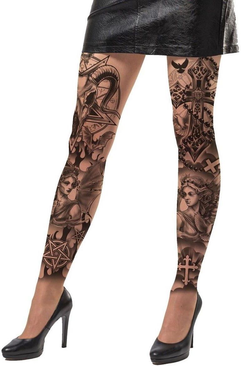 Rajstopy z tatuażem z szatańskim motywem. Idealny dodatek do stroju np. wiedźmy na Halloween lub Andrzejki. Rozmiar uniwersalny, dla osoby dorosłej. Opakowanie: 1 para.