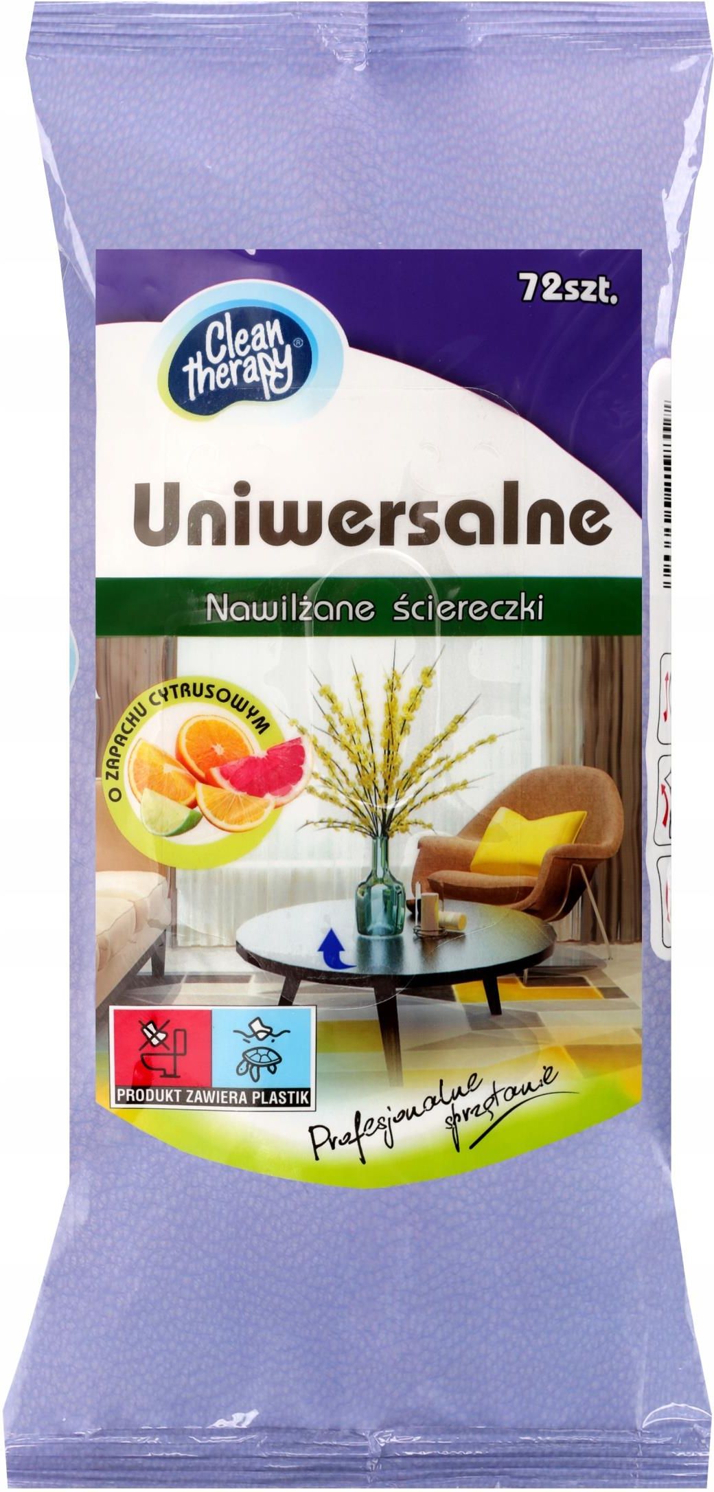 CLEAN THERAPY Ściereczki nawilżane uniwersalne – 72 sztuki, cytrusowy zapach CLEAN THERAPY to praktyczne i skuteczne nawilżane ściereczki czyszczące, które doskonale sprawdzą się w codziennym sprzątaniu. Dzięki świeżemu cytrusowemu zapachowi i zawartości lotnego silikonu, zapewniają czystość bez smug i dodatkowy połysk na różnych powierzchniach. Ściereczki są gotowe do użycia – idealne do szybkiego przecierania mebli, blatów, drzwi, sprzętów AGD i innych elementów wyposażenia domu. Nie wysuszają dłoni i nie pozostawiają tłustych śladów. Zalety produktu: Uniwersalne zastosowanie – do mebli, powierzchni plastikowych, metalowych, szklanych Zapach cytrusowy – odświeża powietrze podczas sprzątania Bez smug i zacieków – lotny silikon zapobiega powstawaniu śladów Bezpieczne dla skóry dłoni – łagodna formuła nie podrażnia Praktyczne opakowanie – 72 sztuki w zaklejanym worku, dłużej zachowują wilgotność Natychmiast gotowe do użycia – idealne do szybkich porządków Zastosowanie: Meble i blaty Drzwi, parapety, ramy okienne Urządzenia AGD i RTV Powierzchnie z tworzyw sztucznych i metalu CLEAN THERAPY 72 sztuki to wygoda i skuteczność w jednym – czystość zawsze pod ręką, bez konieczności użycia wody czy detergentów.