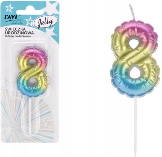 Świeczka urodzinowa Jelly 8 Wykonana z wysokiej jakości parafiny, ta pastelowa świeczka to idealna dekoracja na tort, która wprowadzi subtelny, a zarazem radosny nastrój. Jej delikatne pastelowe kolory pasują do każdej tematyki przyjęcia, a szpikulec do łatwego wbijania zapewnia wygodę podczas dekorowania. Świeczka w kształcie cyfry to doskonały sposób na uczczenie kolejnego wyjątkowego roku w Twoim życiu! CECHY PRODUKTU: Świeczka urodzinowa w kształcie cyferki Wykonana z parafiny Pastelowy kolor Szpikulec do wbijania w tort